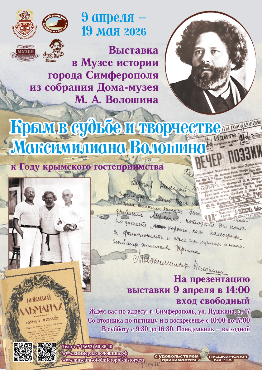 В выставочном зале Музея истории города Симферополя муниципального образования городской округ Симферополь при поддержке Министерства культуры Республики Крым и Музея-заповедника «Киммерия М.А. Волошина» 09 апреля в 14:00 состоится открытие выставки «Крым в судьбе и творчестве Максимилиана Волошина» из фондового собрания Дома-музея М. А. Волошина.